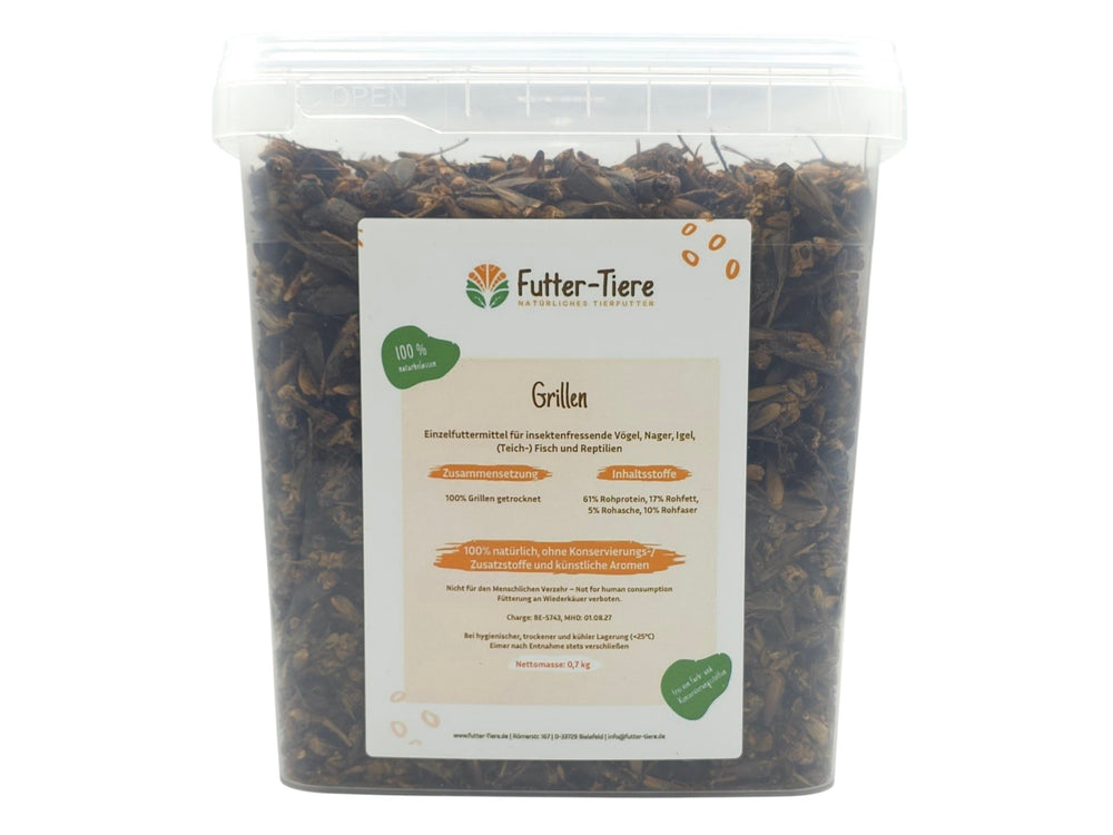 Die Futtermenge richtet sich nach Tierart, Größe und individuellem Bedarf. Für kleinere Tiere können die Grillen bei Bedarf zerkleinert werden.