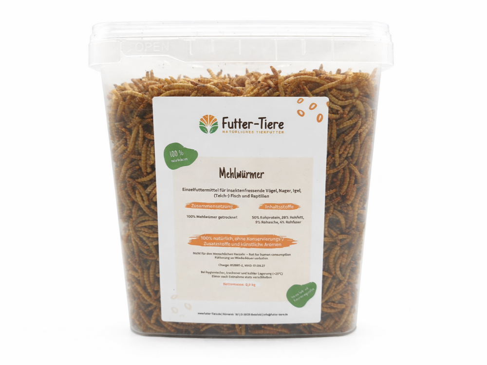 Der Inhalt beträgt 0,9 kg getrocknete Mehlwürmer, was diese Verpackung zu einer besonders ergiebigen Großpackung macht. Ideal für regelmäßige Fütterung oder Vorratshaltung.